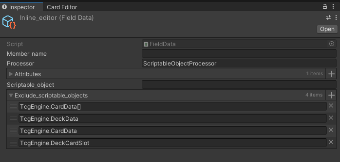 You can remove the restrictions for InlineEditor going to Assets/Moratelli/ToolBelt - TCG Engine/Resources/fields/General/inline\_editor.asset and removing all the strings inside *exclude\_scriptable\_objects*